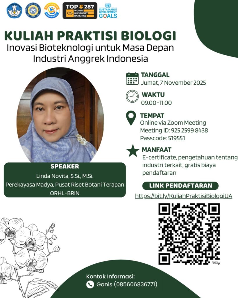 Departemen Biologi, Fakultas Sains dan Teknologi Universitas Airlangga akan kembali menyelenggarakan Kuliah Praktisi Biologi dengan tema “Inovasi Bioteknologi untuk Masa Depan Industri Anggrek Indonesia” pada Jumat, 7 November 2025 pukul 09.00–11.00 WIB secara online melalui Zoom Meeting.