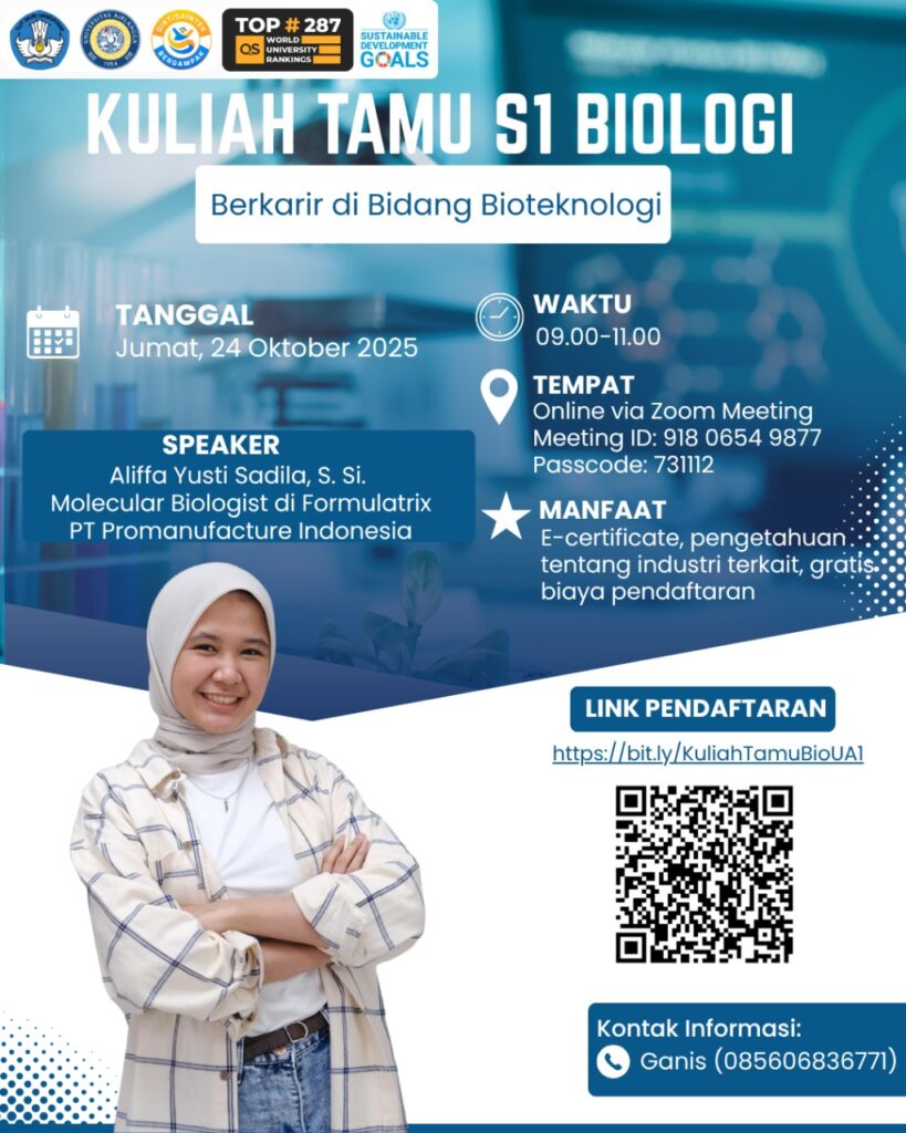Program Studi S1 Biologi sukses menyelenggarakan Kuliah Tamu virtual bertajuk “Berkarir di Bidang Bioteknologi” pada Jumat, 24 Oktober 2025, yang diselenggarakan secara daring melalui platform Zoom Meeting. Acara ini terasa istimewa karena menghadirkan alumni Angkatan 2018 yang berprestasi, yaitu Aliffa Yusti Sadila, S.Si.