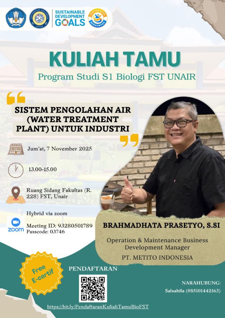 Program Studi S1 Biologi, Fakultas Sains dan Teknologi Universitas Airlangga, akan mengadakan Kuliah Tamu dengan tema “Sistem Pengolahan Air (Water Treatment Plant) untuk Industri” pada Jumat, 7 November 2025, pukul 13.00–15.00 WIB. Kegiatan ini akan berlangsung secara hybrid di Ruang Sidang Fakultas (R.228) FST UNAIR dan juga melalui Zoom Meeting.