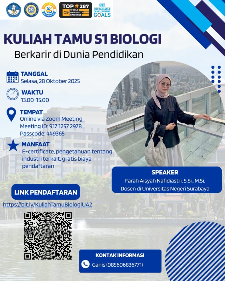 Program Studi S1 Biologi, Fakultas Sains dan Teknologi Universitas Airlangga, kembali mengadakan kegiatan Kuliah Tamu dengan tema “Berkarir di Dunia Pendidikan.” Kegiatan ini dilaksanakan secara daring melalui Zoom Meeting pada Selasa, 28 Oktober 2025, pukul 13.00–15.00 WIB, dan dihadiri oleh mahasiswa aktif Biologi UNAIR yang antusias mendalami peluang karier di bidang pendidikan.