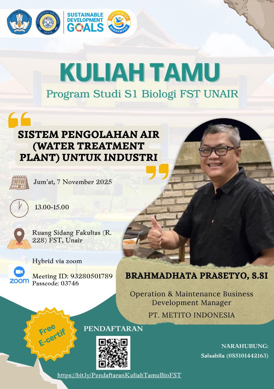 Program Studi S1 Biologi, Fakultas Sains dan Teknologi Universitas Airlangga, akan mengadakan Kuliah Tamu dengan tema “Sistem Pengolahan Air (Water Treatment Plant) untuk Industri” pada Jumat, 7 November 2025, pukul 13.00–15.00 WIB.