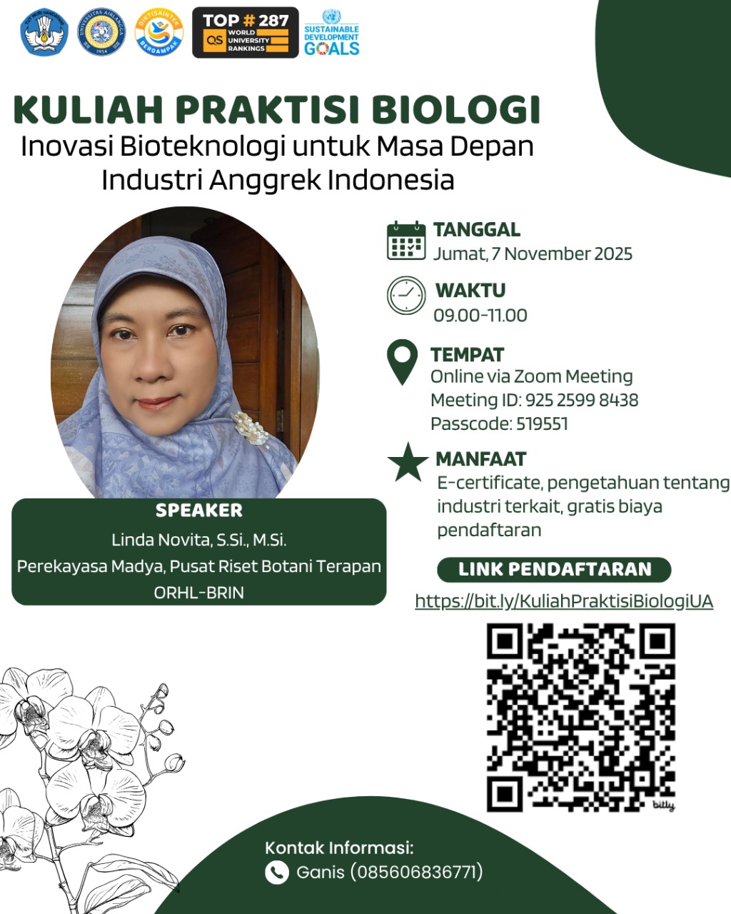 Departemen Biologi, Fakultas Sains dan Teknologi Universitas Airlangga akan kembali menyelenggarakan Kuliah Praktisi Biologi dengan tema “Inovasi Bioteknologi untuk Masa Depan Industri Anggrek Indonesia” pada Jumat, 7 November 2025 pukul 09.00–11.00 WIB secara online melalui Zoom Meeting.